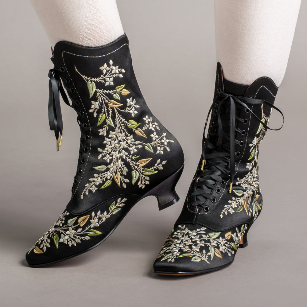 Indulge in a piece of history with Flora Embroidered Boots, an exclusive reproduction of the intricate opera and evening boots popular in the late Victorian period. Expertly crafted with intricate botanical detailing, these stunning satin boots will take you back to an era of sophistication and finesse. Wear them with bustle and Belle Epoque attire from the 1870s to c. 1900, or with modern dress as a statement piece.