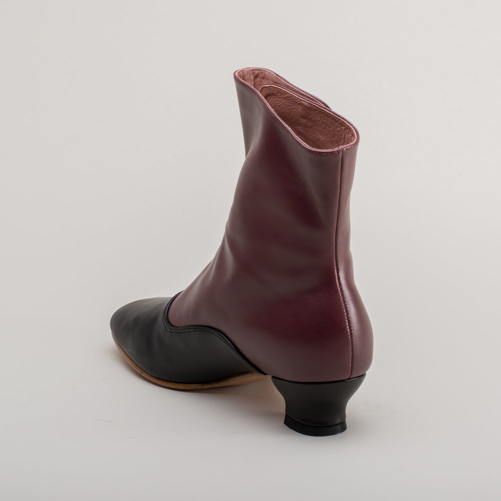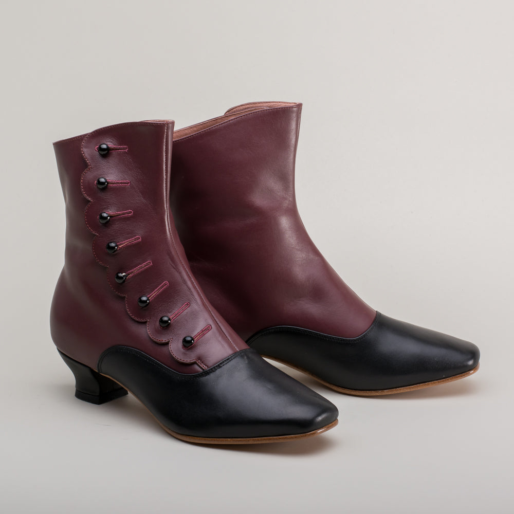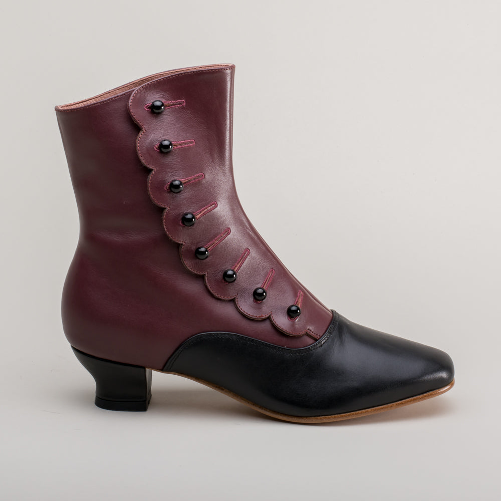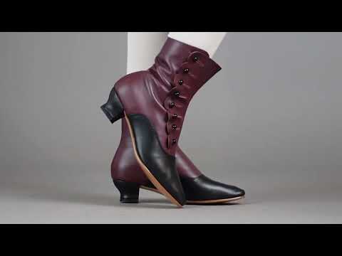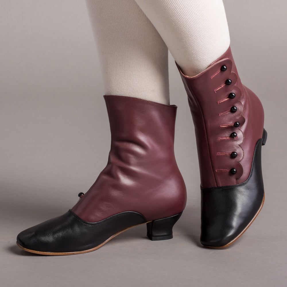 These mid-Victorian and Bustle Era boots have square toes, a short heel molded from an original, and an attractive scalloped edge and top, making them practical yet feminine, and ideal for a fashionable Victorian lady.