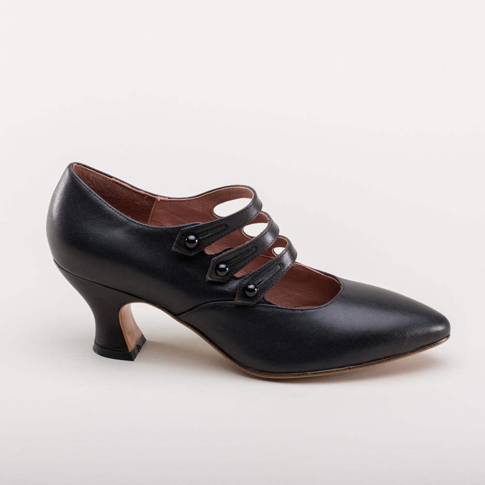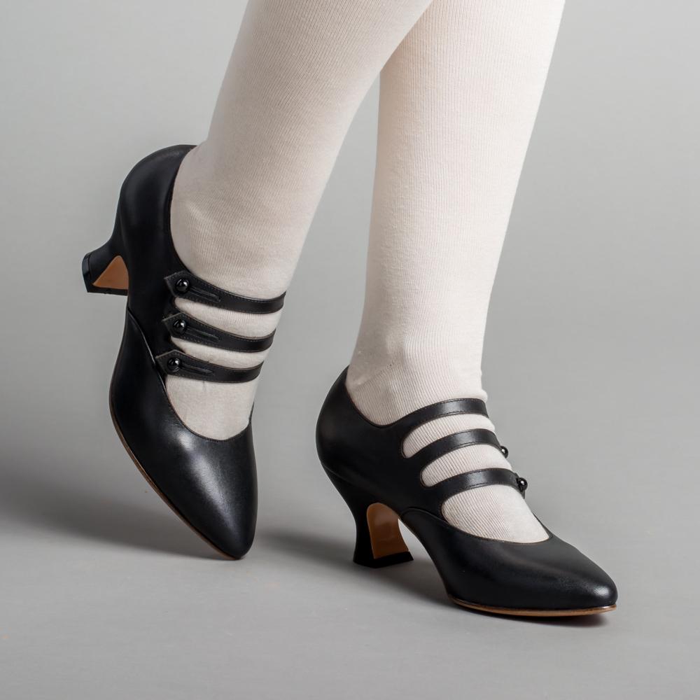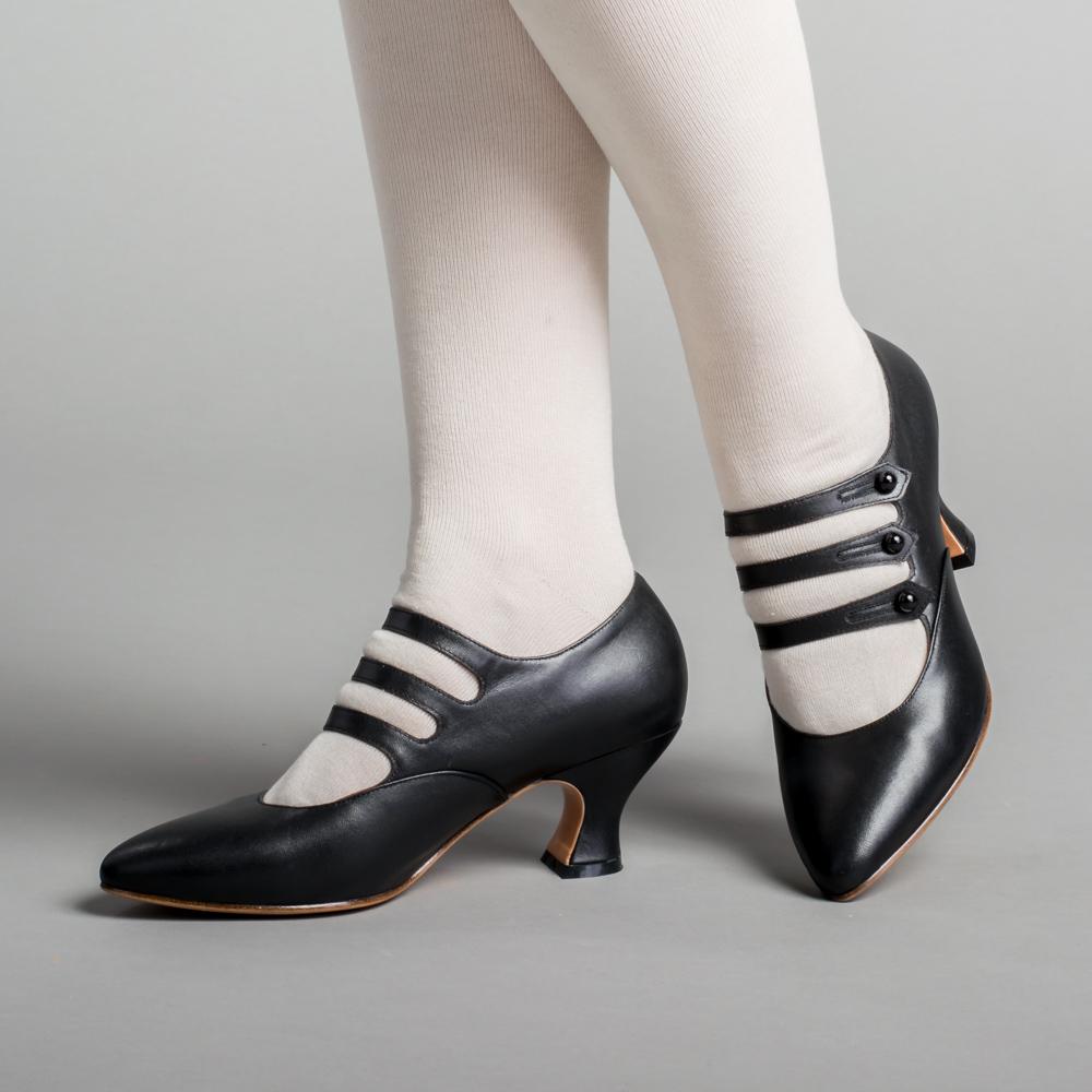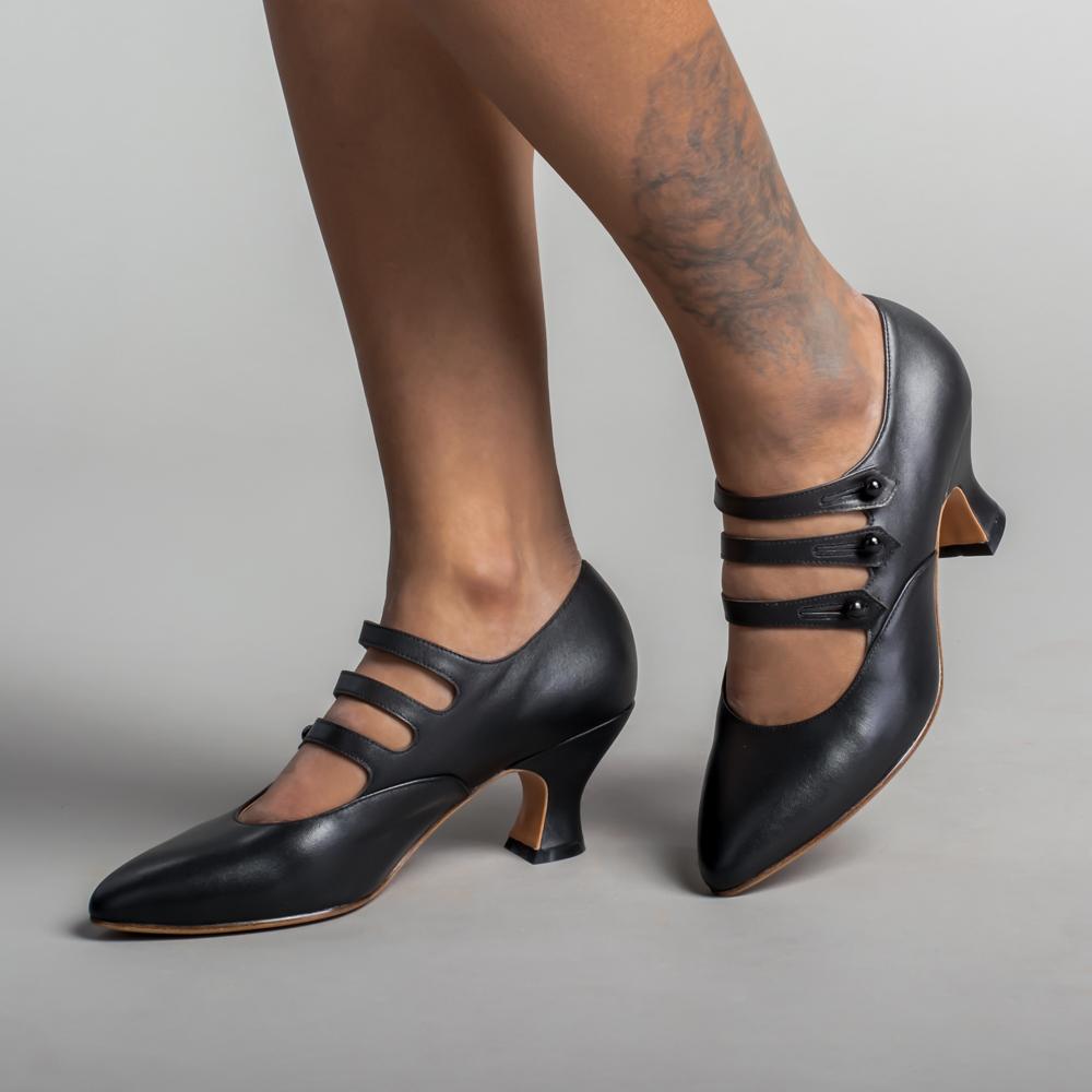 Bellatrix Edwardian Shoes are a stunning and versatile recreation of a classic Edwardian design. Bellatrix feature the iconic side-button triple straps so fashionable in this period. The 2.25 in / 5.7 cm French heel is delicate and well-balanced, paired with a pointed toe to create the perfect Edwardian and 1920s silhouette. Wear Bellatrix with fashion from the turn of the 20th century all the way through the mid-1920s, or with your Gothic, Lolita, cottagecore, dark academia, and historybounding outfits, as well as historical WWI, Downton Abbey and particularly Titanic era dress.