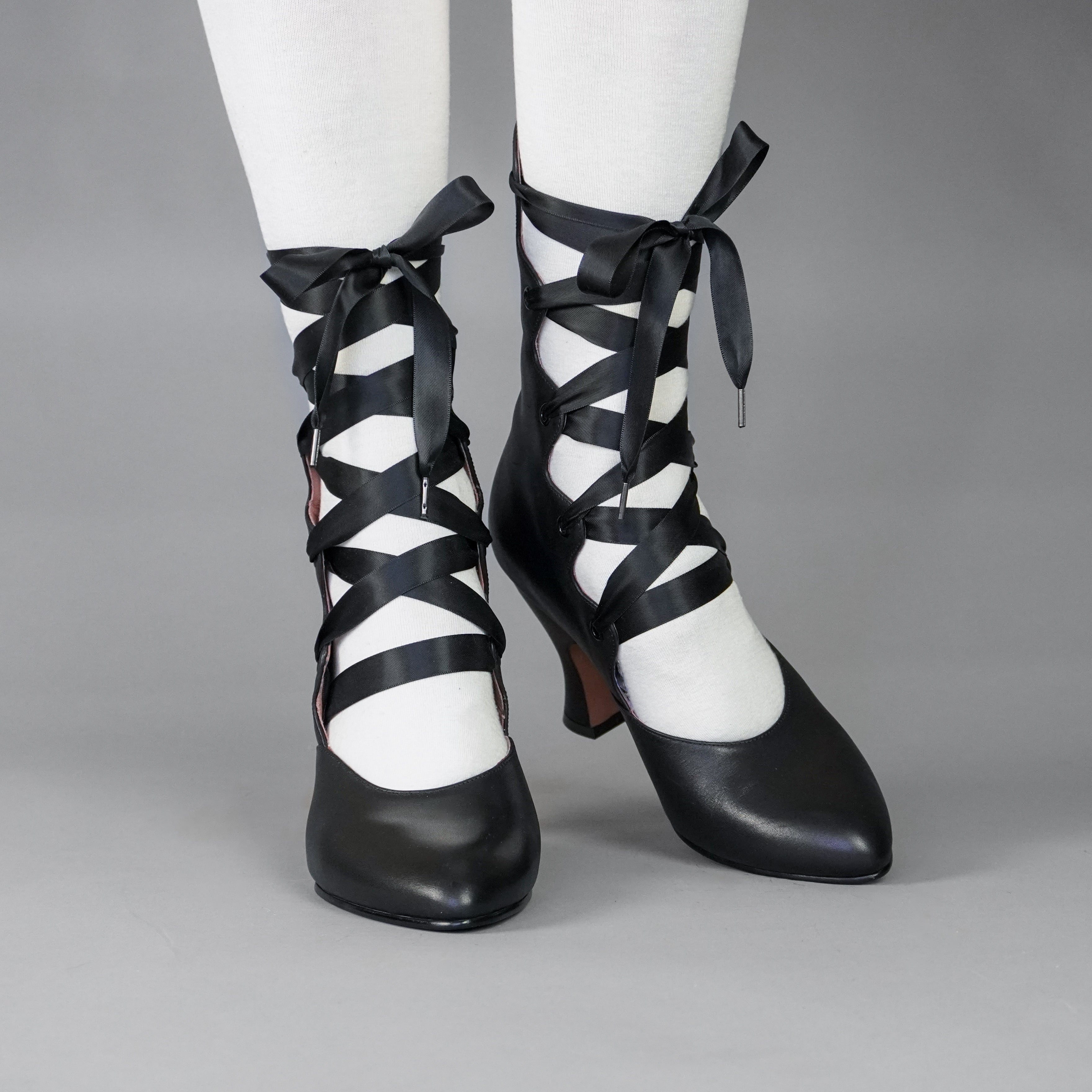 Tango Edwardian Boots are just as seductive as the Tango dance craze that swept the world in the 1910s. Designed to show off the legs, these gorgeous lace-up boots are based on several antique examples from 1900 through 1920. Tango features a deliciously curved shaft and scalloped tabs, which are laced with double-faced satin ribbon laces. Tango comes with two sets of ribbon laces, for adjustable sizing. Smooth leather uppers are stunning in a variety of beautiful colors. Tango sports a brand-new, custom 3.5 inch/ 8.9 cm French heel- our highest heel yet! Tango's heel is just as curvy and sumptuous as it is well-balanced, so you can dance the night away.