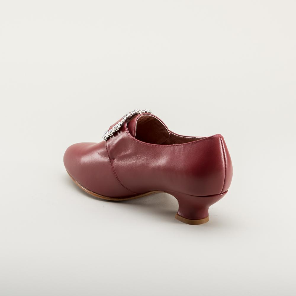 Kensington 18th Century Shoes offer comfort, style, and practicality all in one. Constructed of 100% top-quality leather, with real Italian leather soles, Kensington is the perfect shoe for Revolutionary War reenactors and features all the hallmarks of a historically accurate late Georgian shoe - hand-stretched pointed toe, custom-made Louis heels, and latchet closure ready to take our reproduction Valois, Fleur or Dauphine rhinestone buckles.